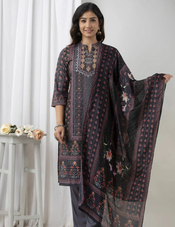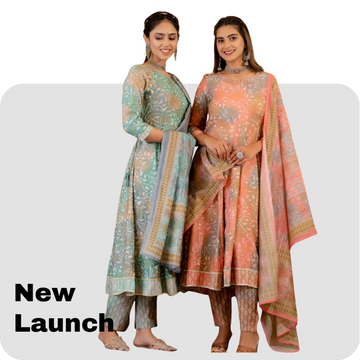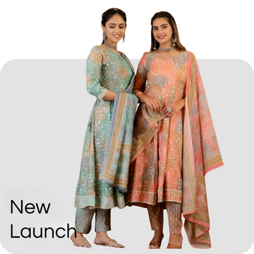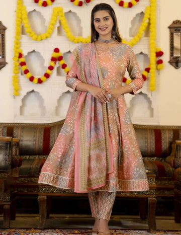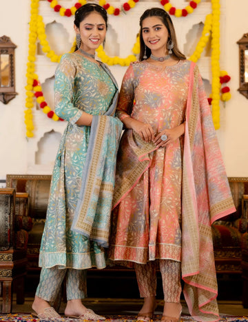 This sea green muslin salwar suit features a flared kurta with a round neckline, three-quarter sleeves, and elegant block-printed floral motifs. Paired with a matching pant and a floral dupatta with lined borders for a graceful finish